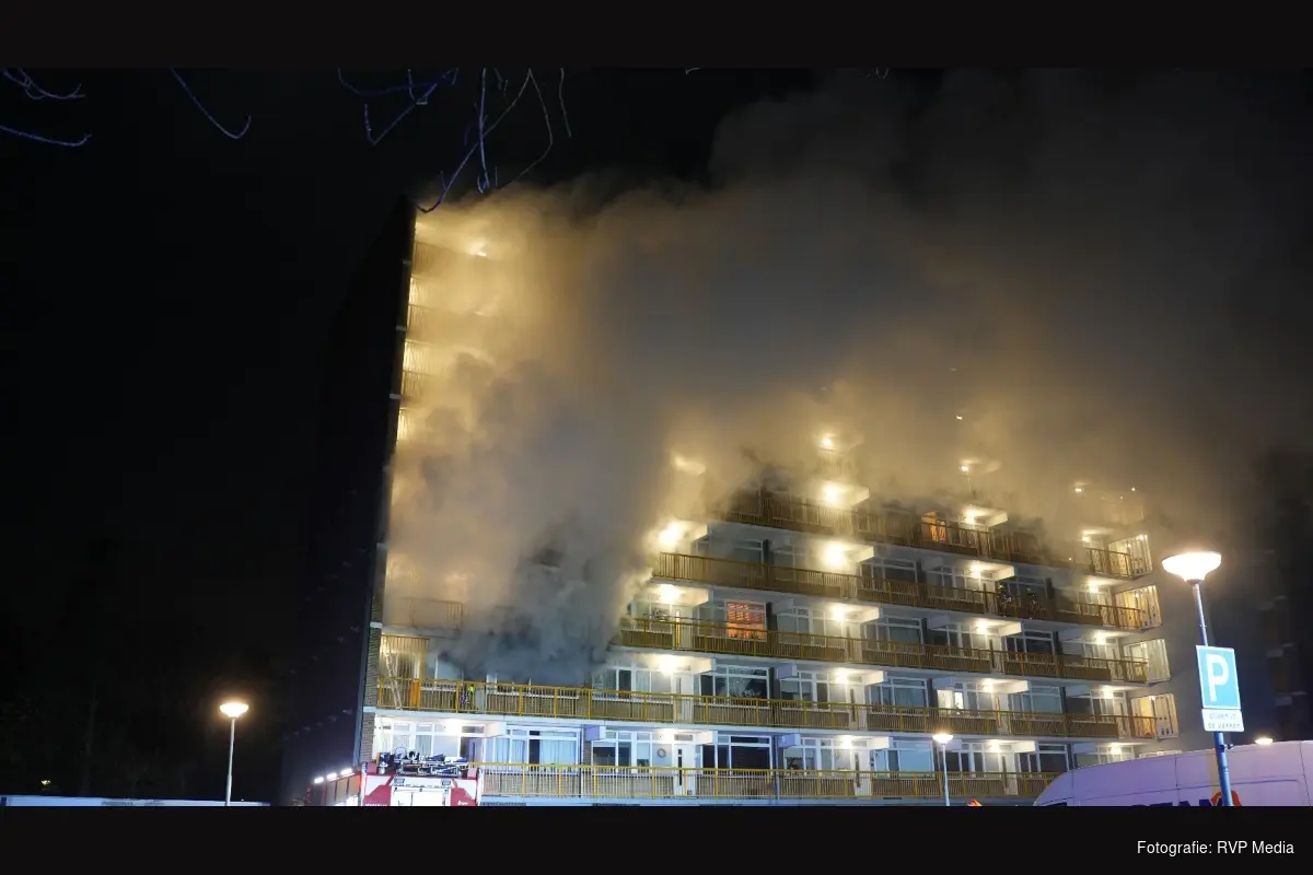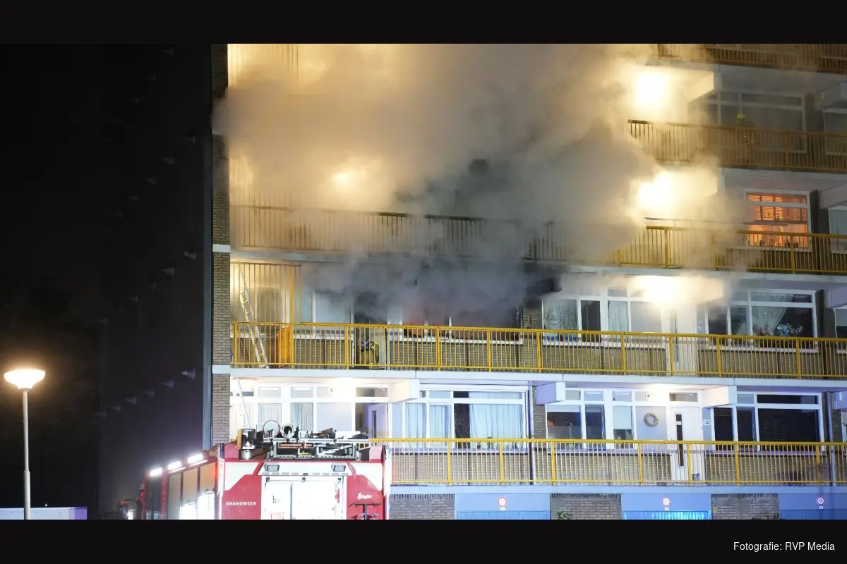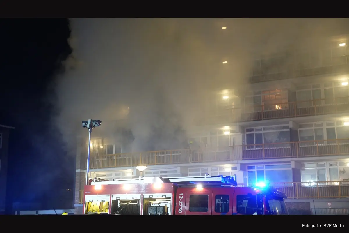 HEEMSKERK - In de nacht van donderdag op vrijdag is de brandweer omstreeks 02.30 uur opgeroepen voor een grote brand in een flat aan de Jan Ligthartstraat. Bij aankomst van de brandweer bleek het te gaan om een brand in een woning op de tweede etage van een acht tellende etages hoge flat.