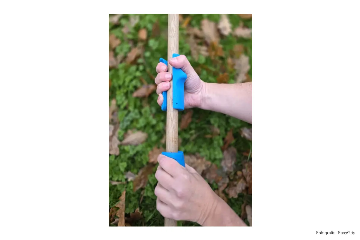 De EasyGrip handgreep is een ergonomische greep die je om de steel van een hark, bezem of dweil klikt. Door de vorm en de extra steun voor de vingers wordt de druk op de handen minder. De handgreep is ook te gebruiken bij het dragen van bijvoorbeeld een boodschappentas of emmer. Zo helpt EasyGrip mensen met hand- en vingerklachten, maar ook iedereen die gewoon wat comfortabeler wil werken in huis en tuin.